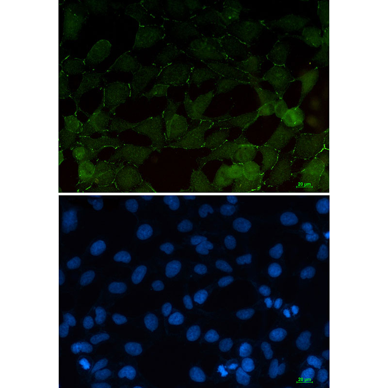 Immunocytochemistry analysis of beta Catenin (green) in 293T using beta Catenin antibody,and DAPI(blue). |