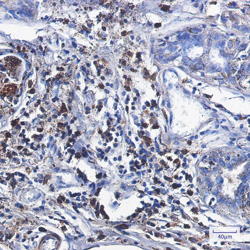 Immunohistochemistry analysis of paraffin-embedded Human breast cancer using Catalase antibody. High-pressure and temperature Sodium Citrate pH 6.0 was used for antigen retrieval. |