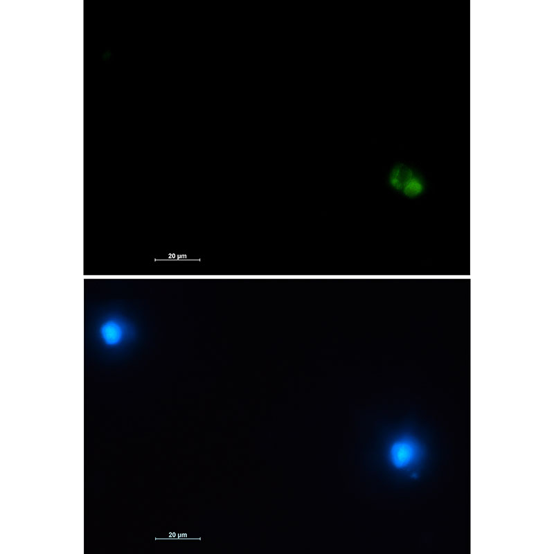 Immunocytochemistry analysis of CD22 (green) in HL-60 using CD22 antibody,and DAPI(blue). |