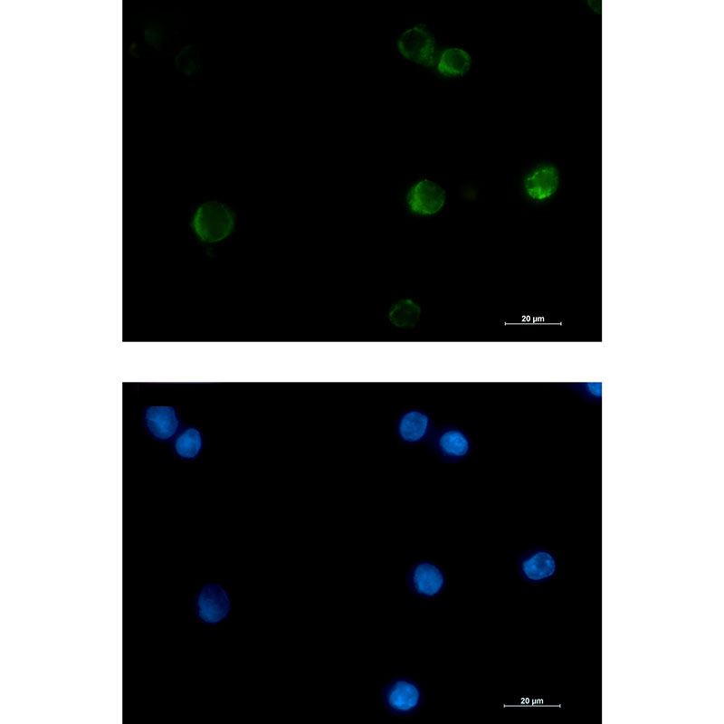 Immunocytochemistry analysis of Cytochrome C (green) in K562 using Cytochrome C antibody,and DAPI(blue). |