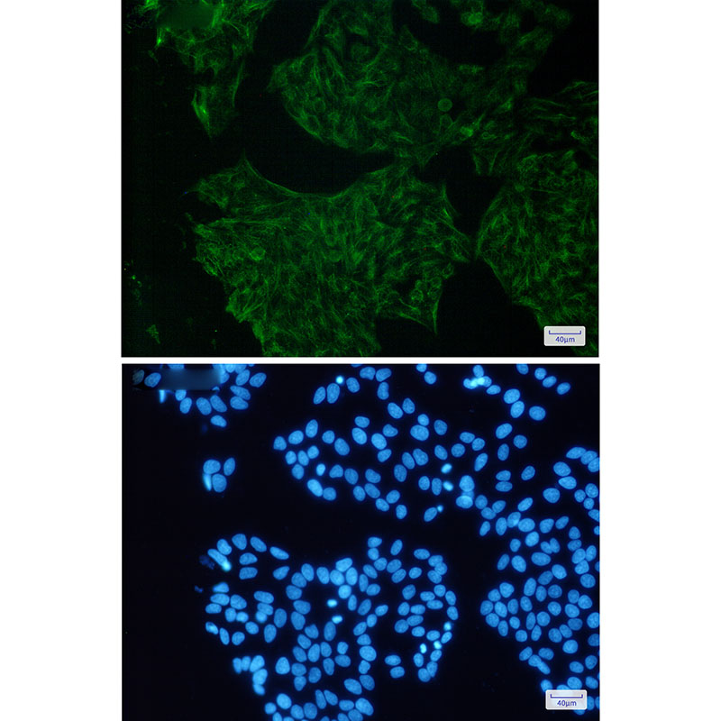 Immunocytochemistry analysis of Cytokeratin 18(green) in Hela using Cytokeratin 18 antibody,and DAPI(blue) |