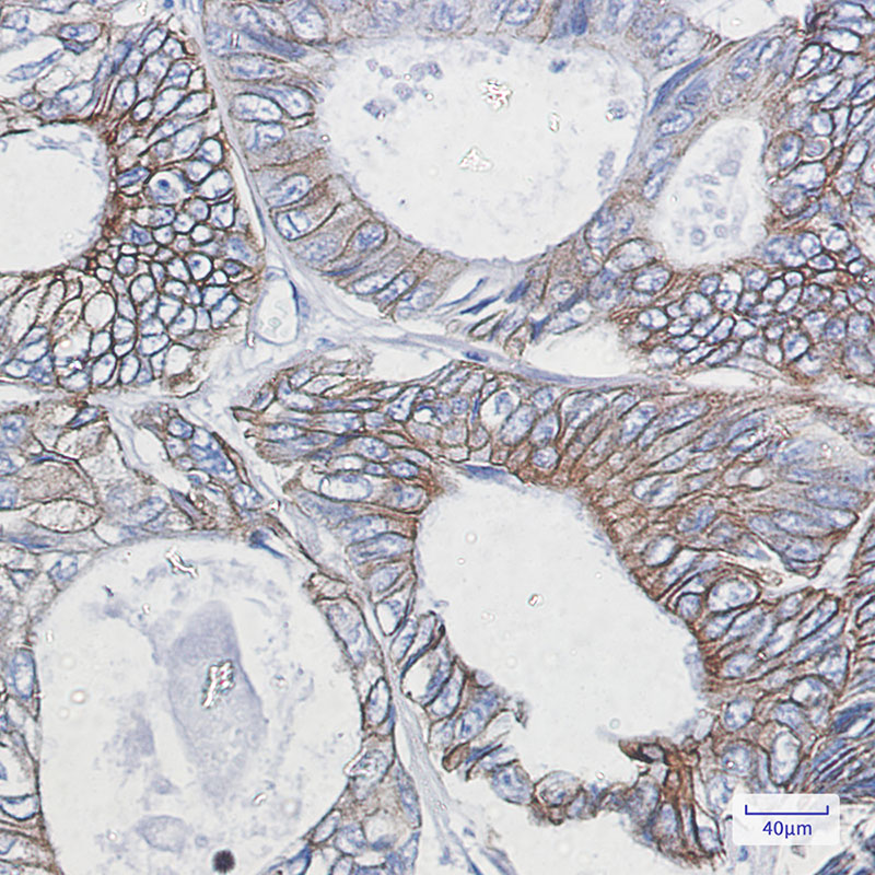 Immunohistochemistry analysis of paraffin-embedded Human colon cancer using Cytokeratin 18 antibody.High-pressure and temperature Sodium Citrate pH 6.0 was used for antigen retrieval. |