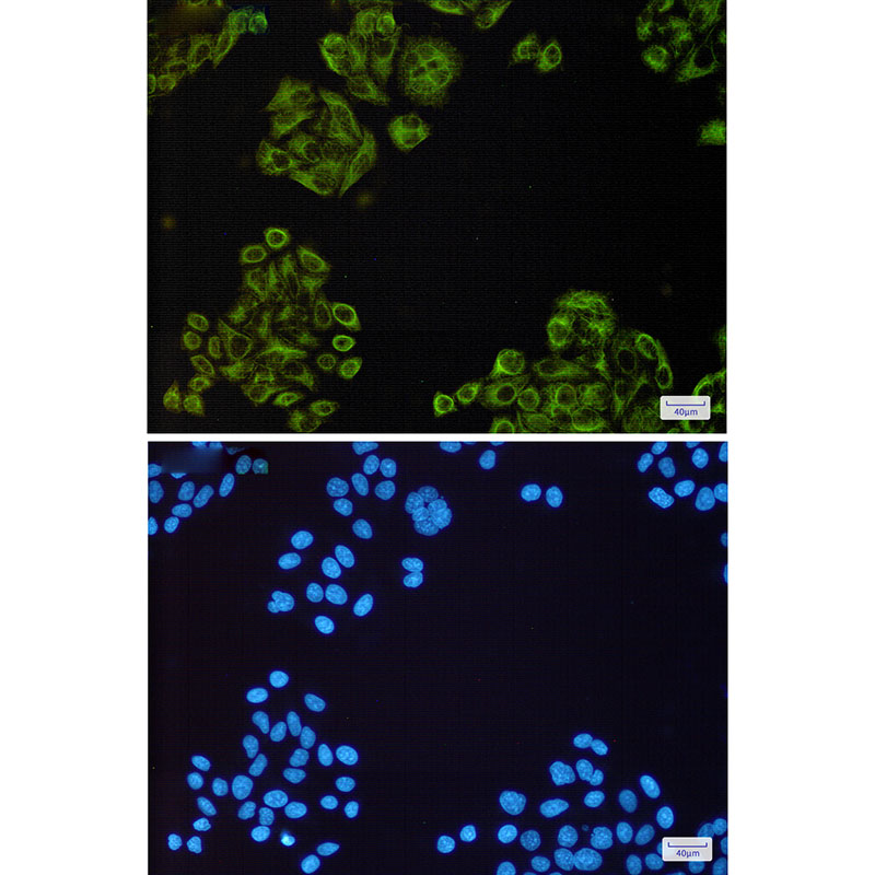 Immunocytochemistry analysis of EGFR(green) in Hela using EGFR antibody,and DAPI(blue) |