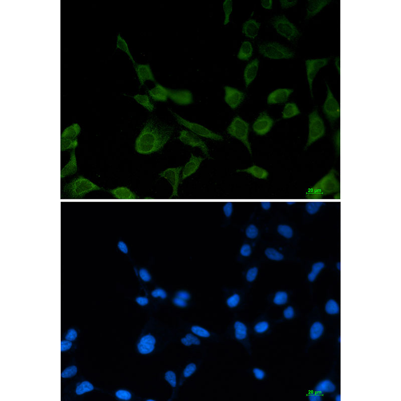 Immunocytochemistry analysis of eIF1A (green) in 293T using eIF1A antibody,and DAPI(blue). |