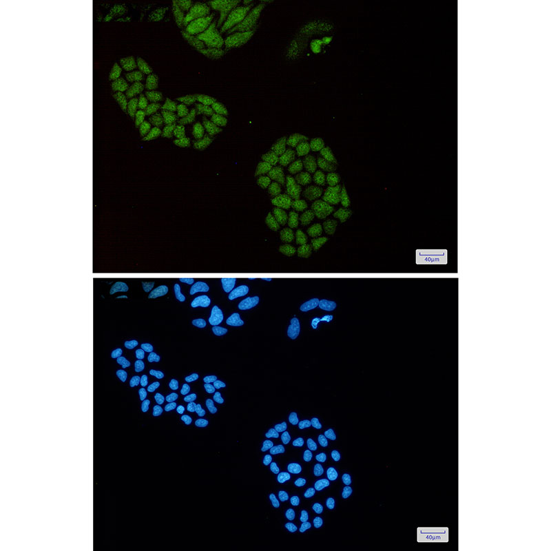 Immunocytochemistry analysis of ENO1(green) in Hela using ENO1 antibody,and DAPI(blue). |