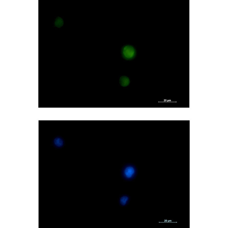 Immunocytochemistry analysis of ERK1/2 (green) in K562 using ERK1/2 antibody,and DAPI(blue). |