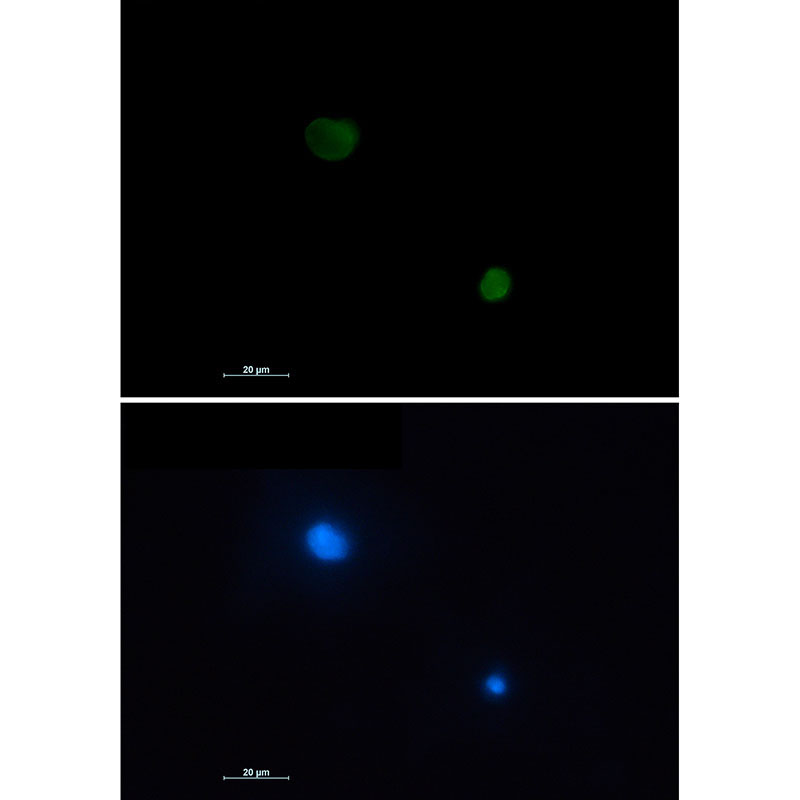 Immunocytochemistry analysis of Fas (green) in HL-60 using Fas antibody,and DAPI(blue). |