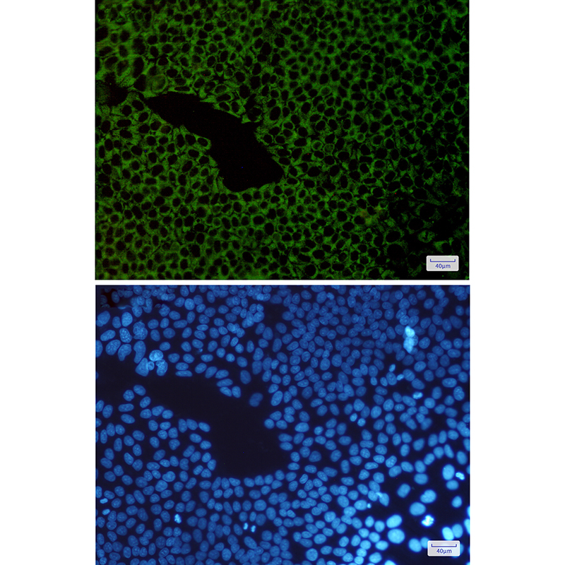 Immunocytochemistry analysis of G3BP(green) in Hela using G3BP antibody,and DAPI(blue) |