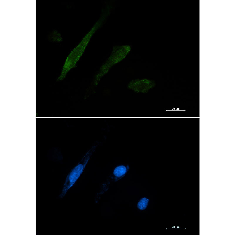 Immunocytochemistry analysis of Galectin 3 (green) in U87-MG using Galectin 3 antibody,and DAPI(blue). |