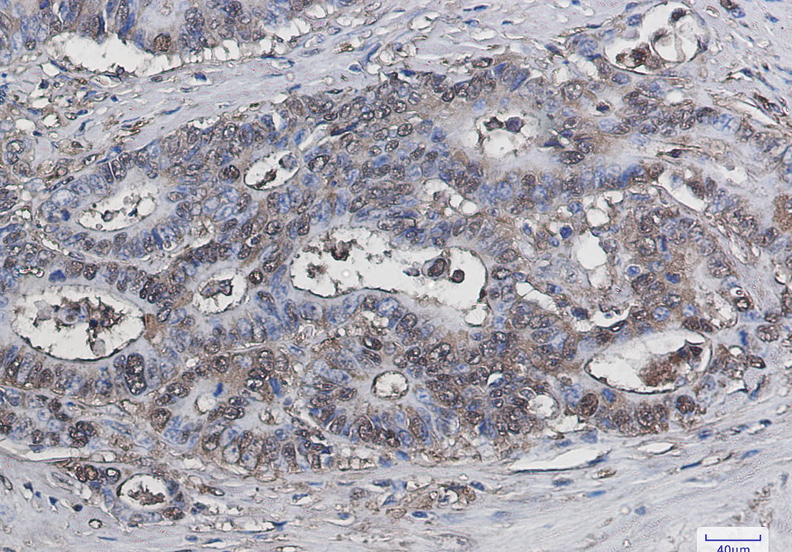 Immunohistochemistry analysis of paraffin-embedded Human colon cancer using Galectin 3 antibody. High-pressure and temperature Sodium Citrate pH 6.0 was used for antigen retrieval. |