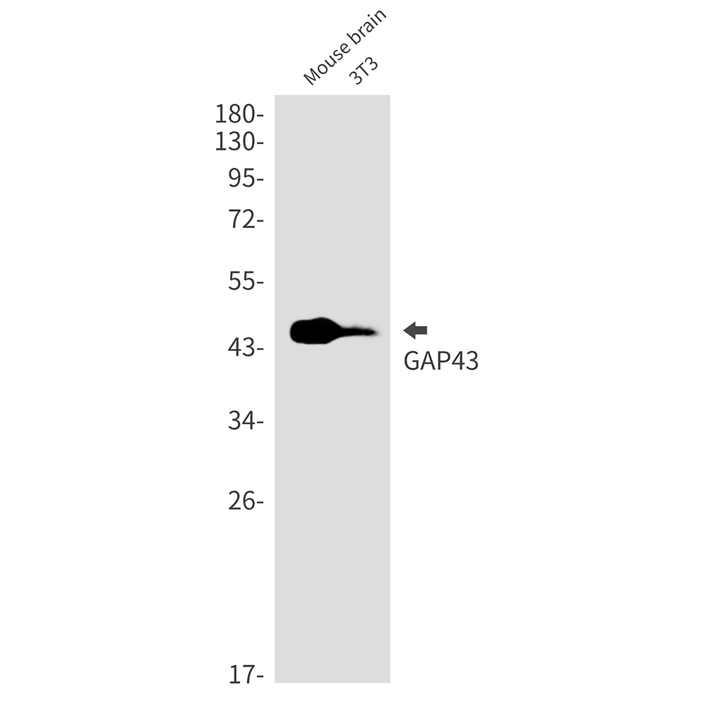 Western blot analysis of GAP43 in mouse brain, 3T3 lysates using GAP43 antibody. |