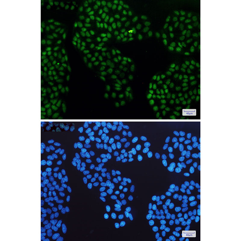 Immunocytochemistry analysis of Glucocorticoid Receptor(green) in Hela using Glucocorticoid Receptor antibody,and DAPI(blue) |