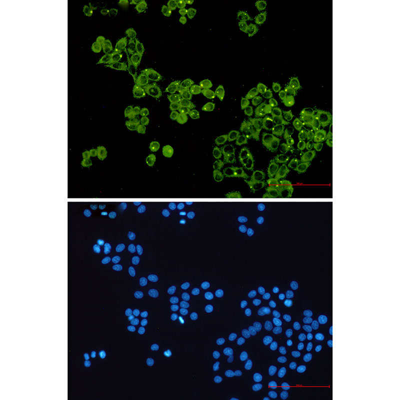 Immunocytochemistry analysis of Glycogen synthase 1 (green) in Hela using Glycogen synthase 1 antibody,and DAPI(blue) |