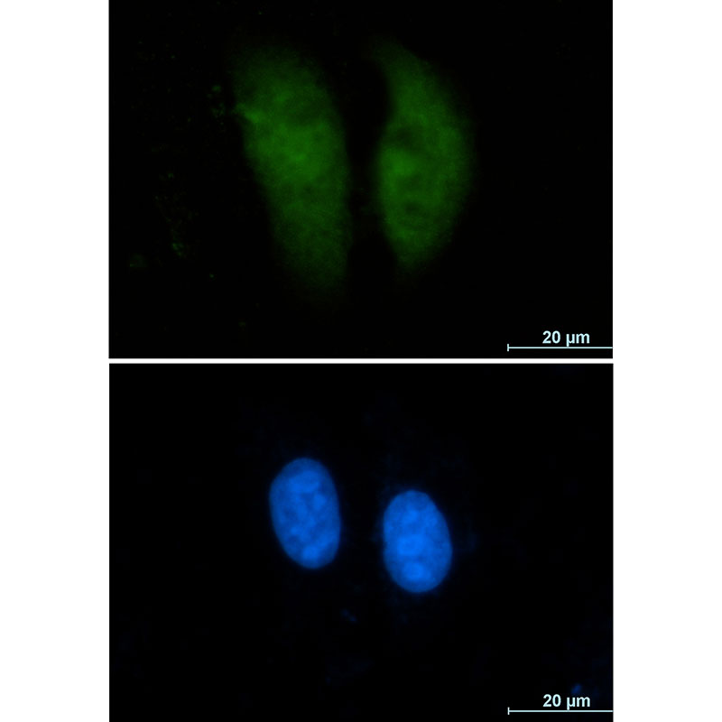 Immunocytochemistry analysis of GST3 (green) in A549 using GST3 antibody,and DAPI(blue). |