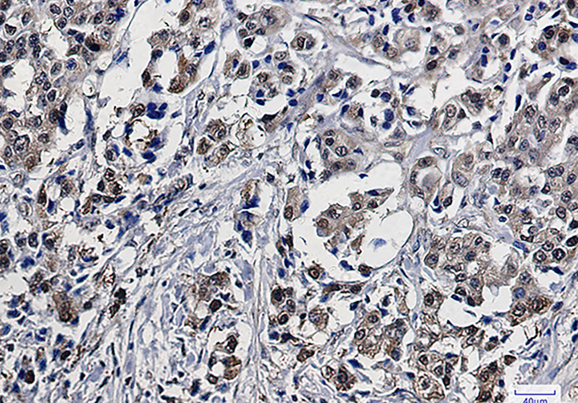 Immunohistochemistry analysis of paraffin-embedded Human lung cancer tissue using GST3/GST pi antibody. High-pressure and temperature Sodium Citrate pH 6.0 was used for antigen retrieval. |