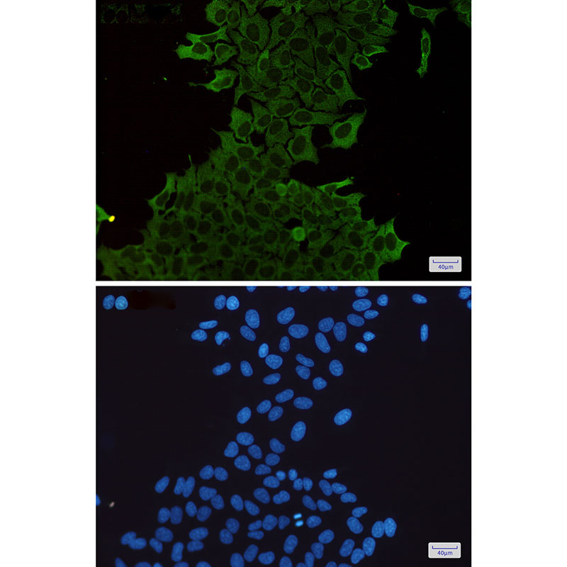 Immunocytochemistry analysis of Hsp70(green) in Hela using Hsp70 antibody,and DAPI(blue) |
