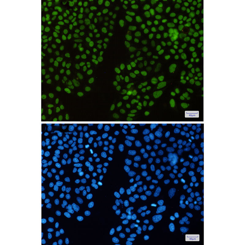 Immunocytochemistry analysis of KAT1(green) in Hela using KAT1 antibody,and DAPI(blue) |