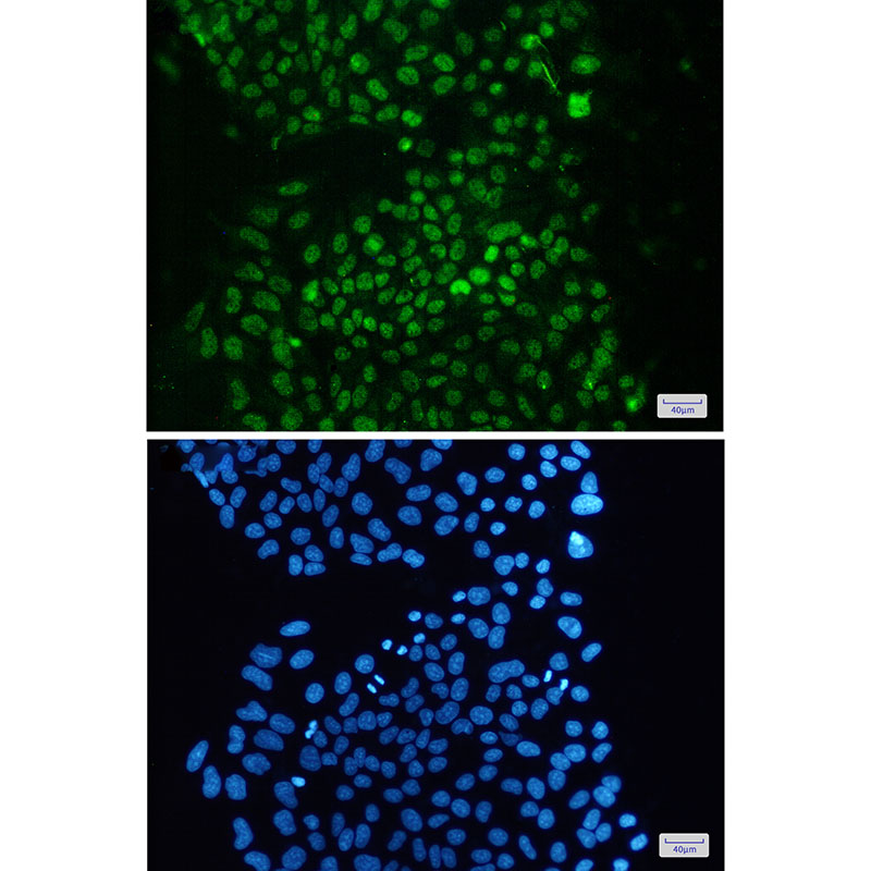 Immunocytochemistry analysis of KDM1/LSD1(green) in Hela using KDM1/LSD1 antibody,and DAPI(blue) |