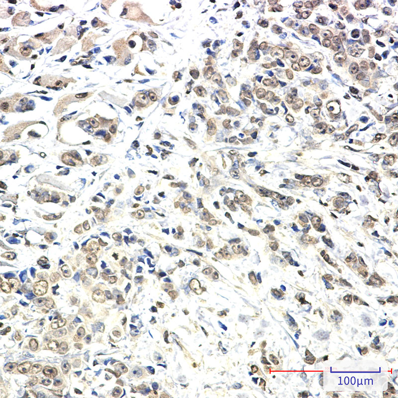 Immunohistochemistry analysis of paraffin-embedded Human breast cancer using KIF5B antibody. High-pressure and temperature Sodium Citrate pH 6.0 was used for antigen retrieval. |