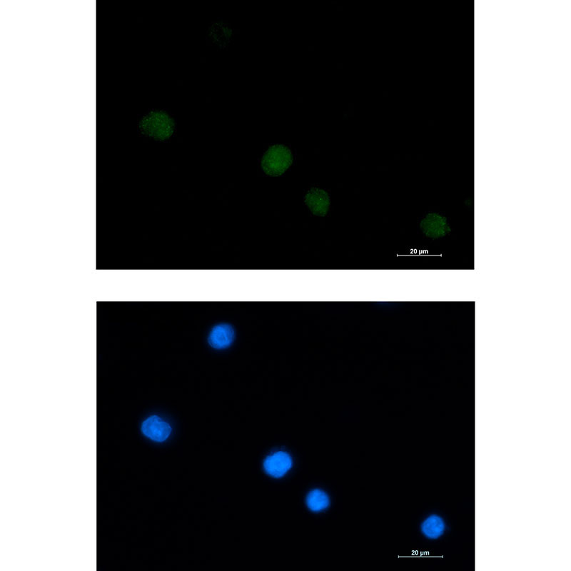 Immunocytochemistry analysis of LGALS14 (green) in K562 using LGALS14 antibody,and DAPI(blue). |
