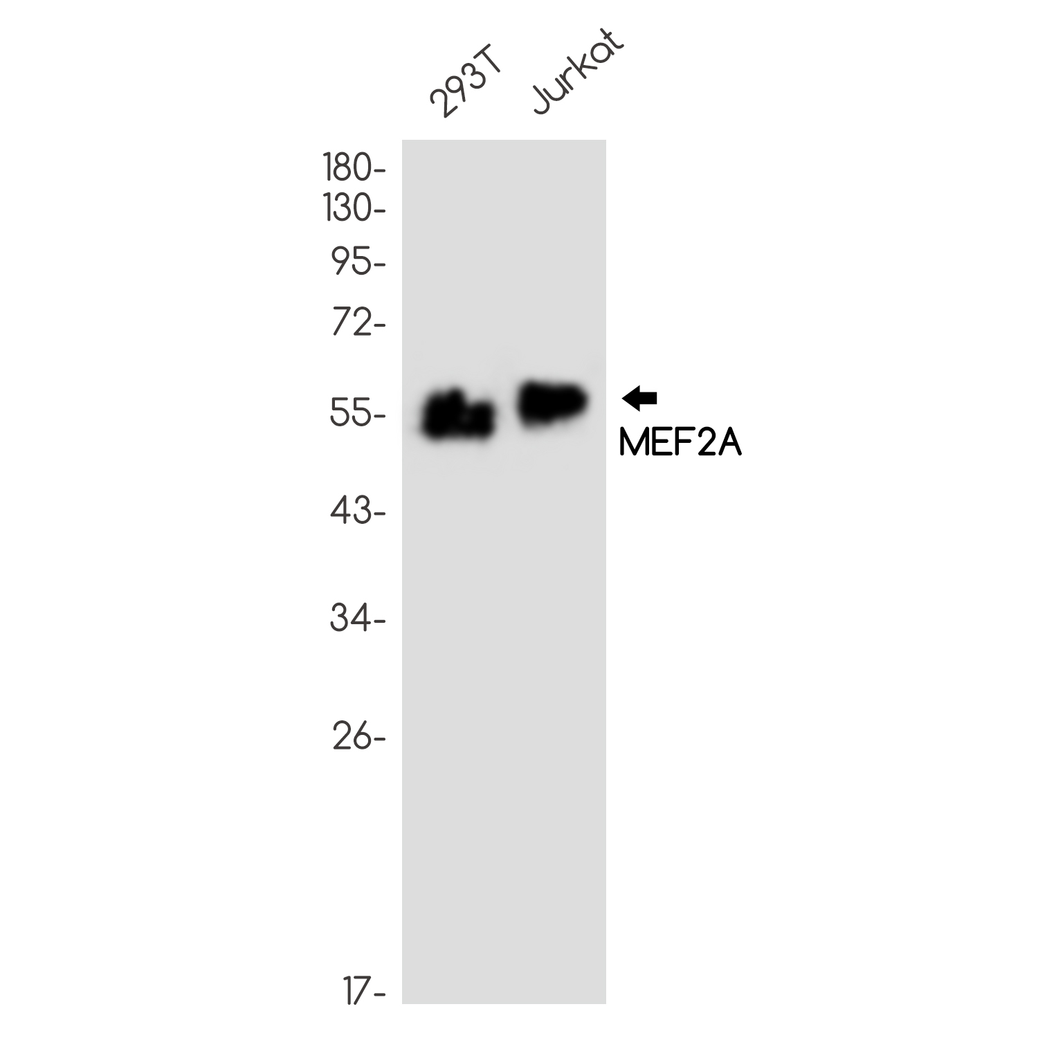 Western blot analysis of MEF2A in 293T, Jurkat lysates using MEF2A antibody. |