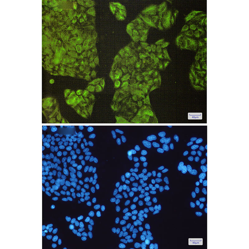 Immunocytochemistry analysis of Nck beta(green) in Hela using Nck beta antibody,and DAPI(blue) |