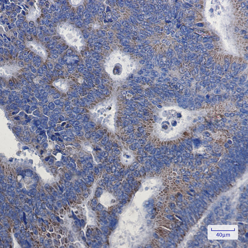 Immunohistochemistry analysis of paraffin-embedded Human colon cancer using NDUFA1 antibody.High-pressure and temperature Sodium Citrate pH 6.0 was used for antigen retrieval. |