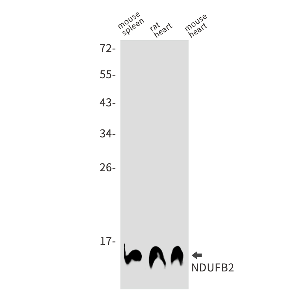 Western blot analysis of NDUFB2 in mouse spleen, rat heart, mouse heart lysates using NDUFB2 antibody. |
