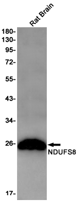 Western blot analysis of NDUFS8 in rat Brain lysates using NDUFS8 antibody. |