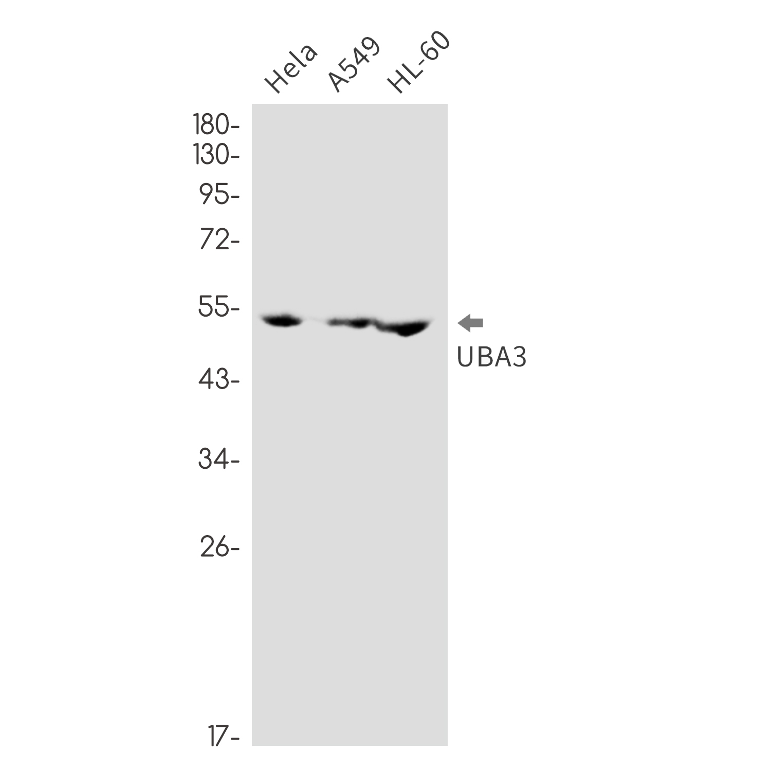 Western blot analysis of UBA3 in Hela, A549, HL-60 lysates using UBA3 antibody. |