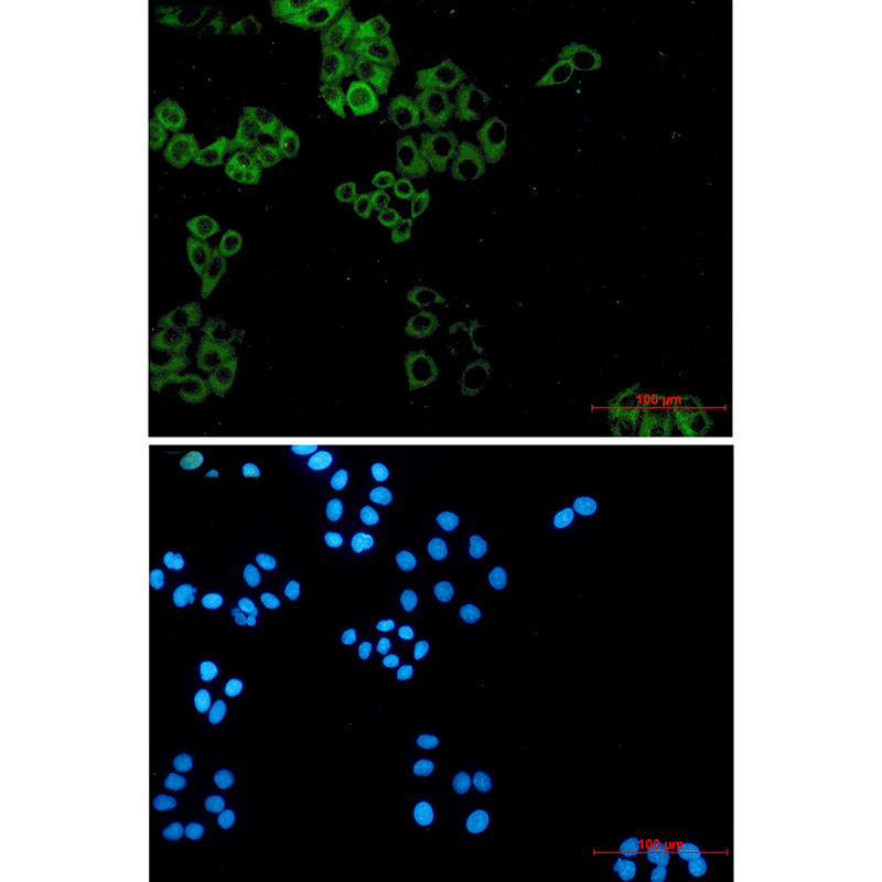 Immunocytochemistry analysis of Paxillin (green) in hela using Paxillin antibody,and DAPI(blue). |