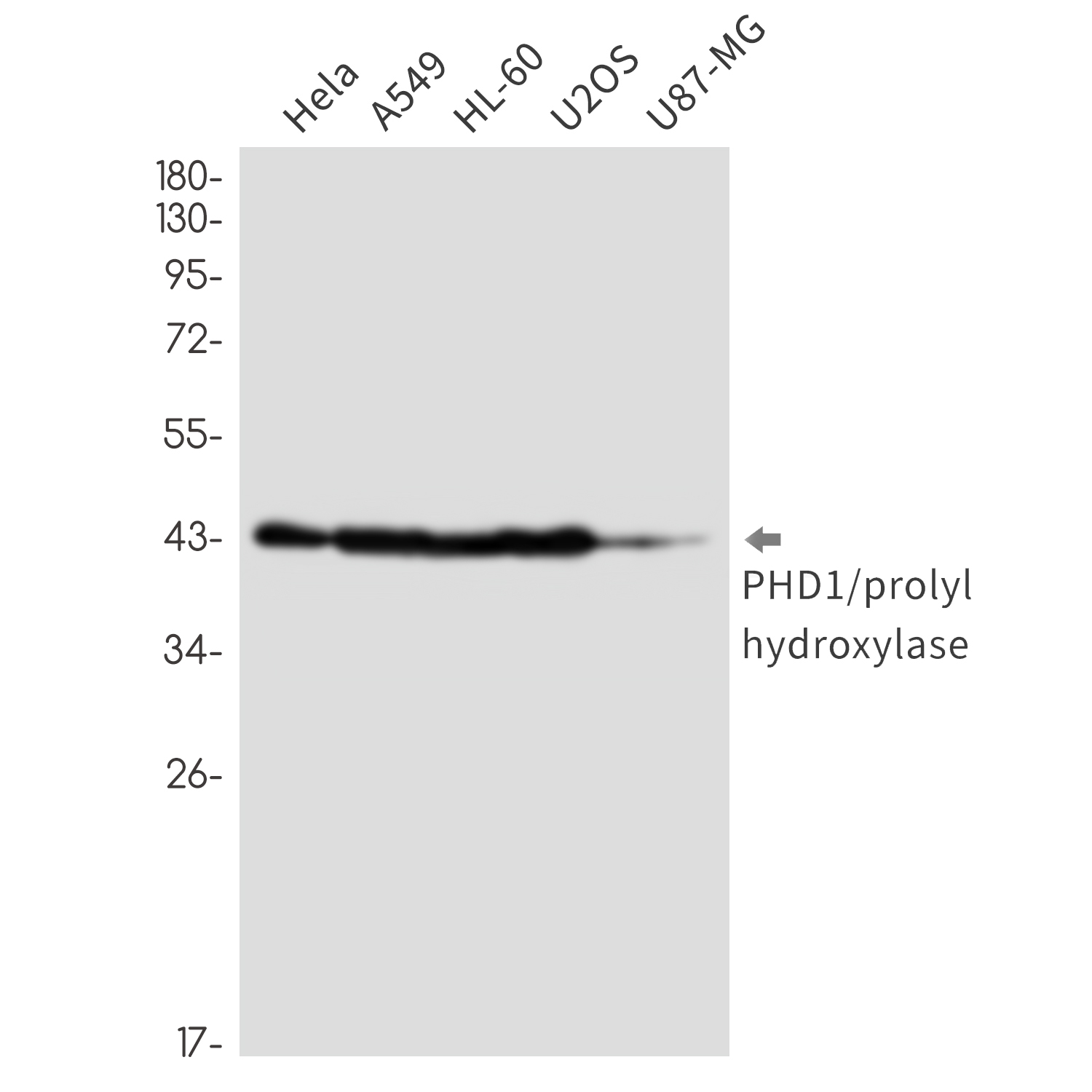 Western blot analysis of PHD1/prolyl hydroxylase in Hela, A549, HL-60, U2OS, U87-MG lysates using PHD1/prolyl hydroxylase antibody. |