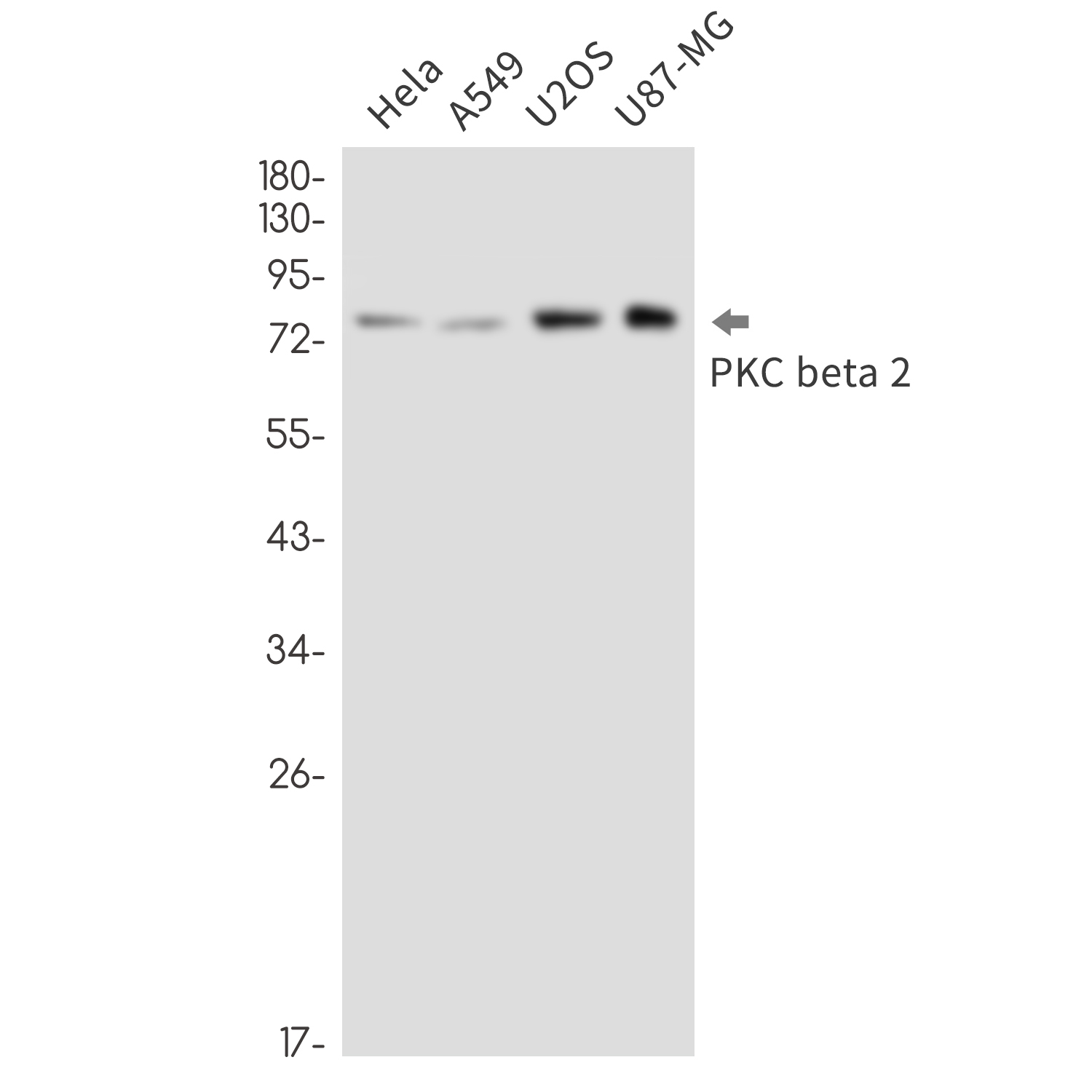 Western blot analysis of PKC beta 2 in Hela, A549, U2OS, U87-MG lysates using PKC beta 2 antibody |