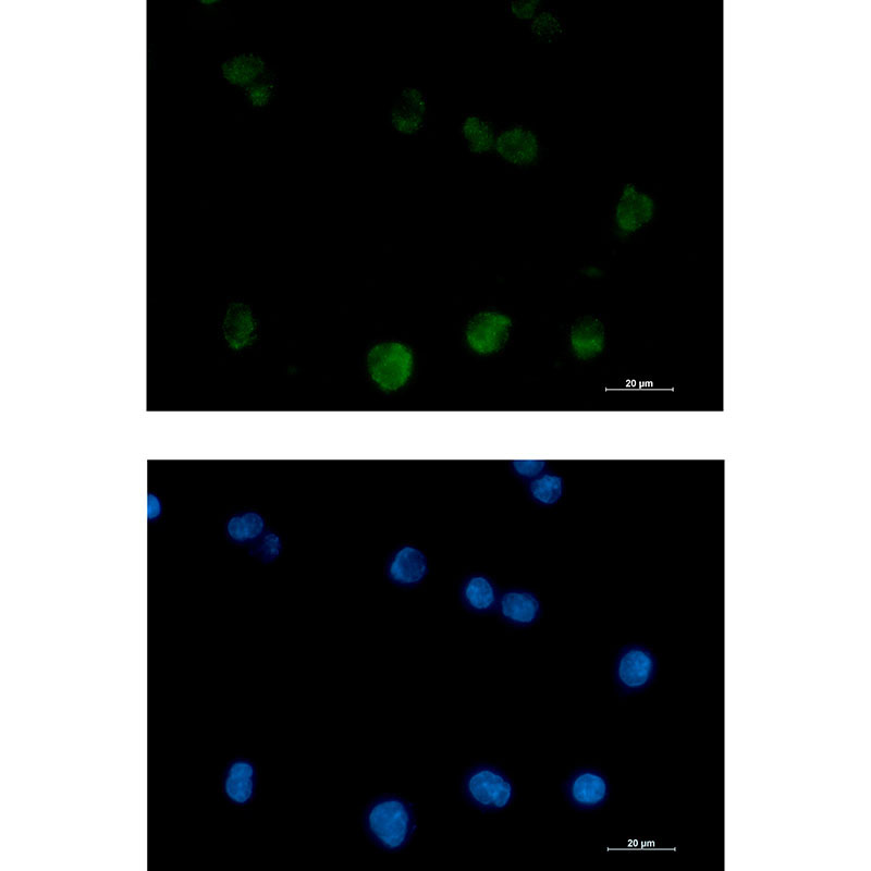 Immunocytochemistry analysis of PKC beta 2 (green) in K562 using PKC beta 2 antibody,and DAPI(blue). |