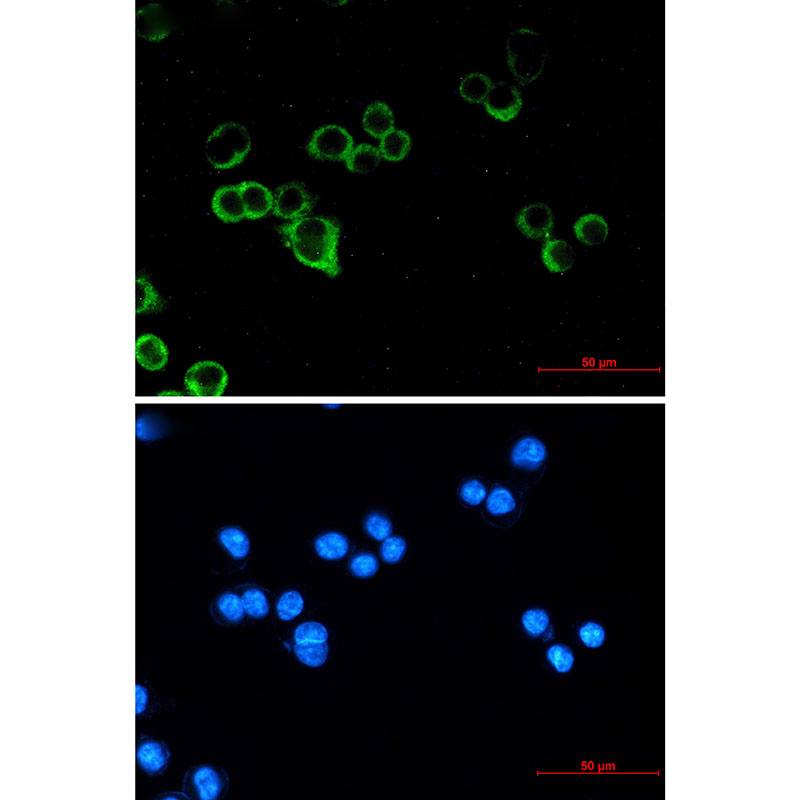 Immunocytochemistry analysis of Raf1 (green) in MCF-7 using Raf1 antibody,and DAPI(blue) |