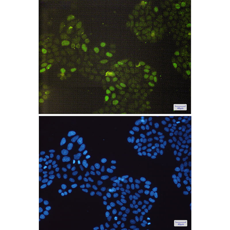 Immunocytochemistry analysis of Rb(green) in Hela using Rb antibody,and DAPI(blue) |