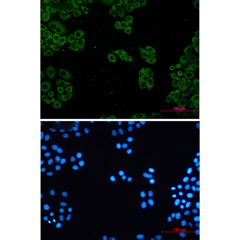 Immunocytochemistry analysis of TCP 1 alpha (green) in Hela using TCP 1 alpha antibody,and DAPI(blue). |