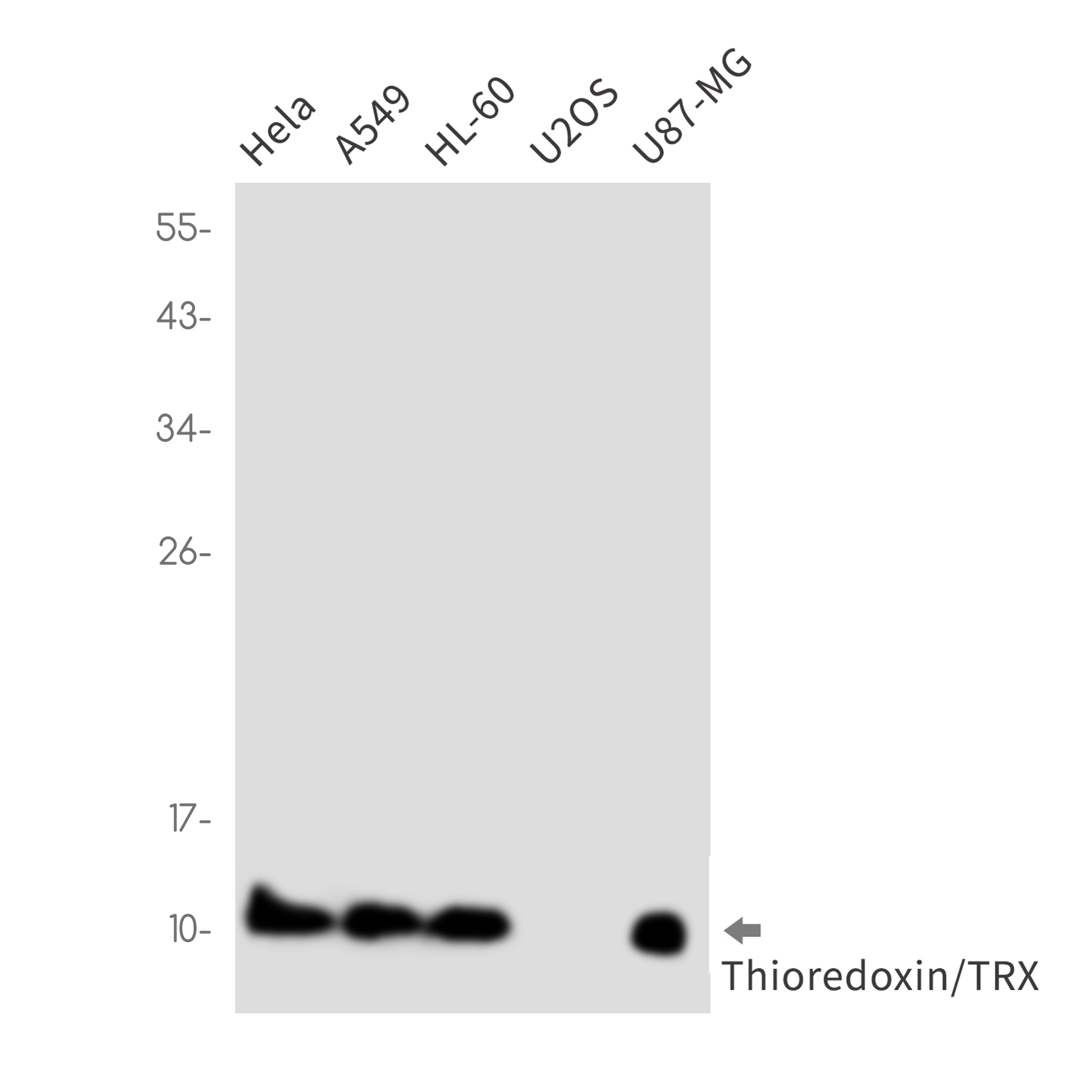 Western blot analysis of Thioredoxin/TRX in Hela, A549, HL-60, U2OS, U87-MG lysates using Thioredoxin/TRX antibody. |