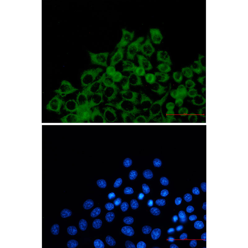 Immunocytochemistry analysis of TOMM2 (green) in Hela using TOMM20 antibody,and DAPI(blue) |