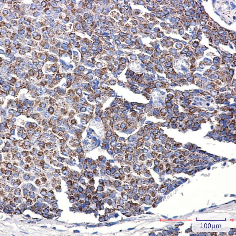 Immunohistochemistry analysis of paraffin-embedded Human breast cancer using TOMM20 antibody.High-pressure and temperature Sodium Citrate pH 6.0 was used for antigen retrieval. |
