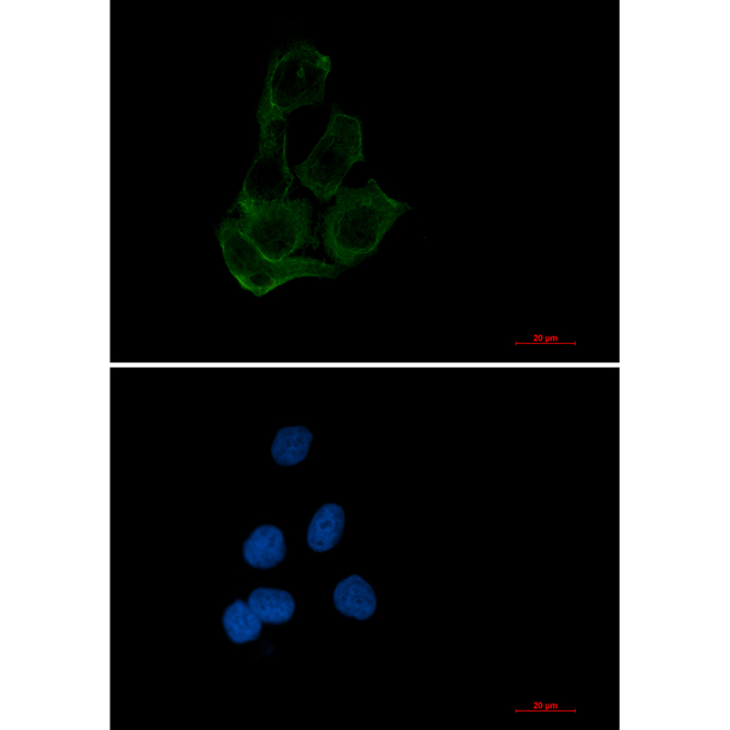Immunocytochemistry analysis of Transcription Factor EB (green) in Hela using Transcription Factor EB antibody,and DAPI(blue). |
