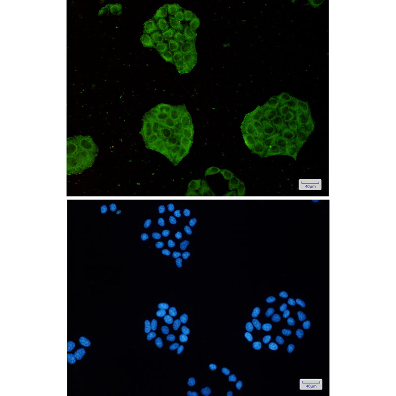 Immunocytochemistry analysis of TRIM56(green) in Hela using TRIM56 antibody,and DAPI(blue) |