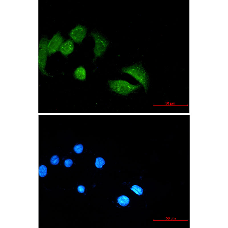 Immunocytochemistry analysis of UBE4B (green) in MCF-7 using UBE4B antibody,and DAPI(blue) |