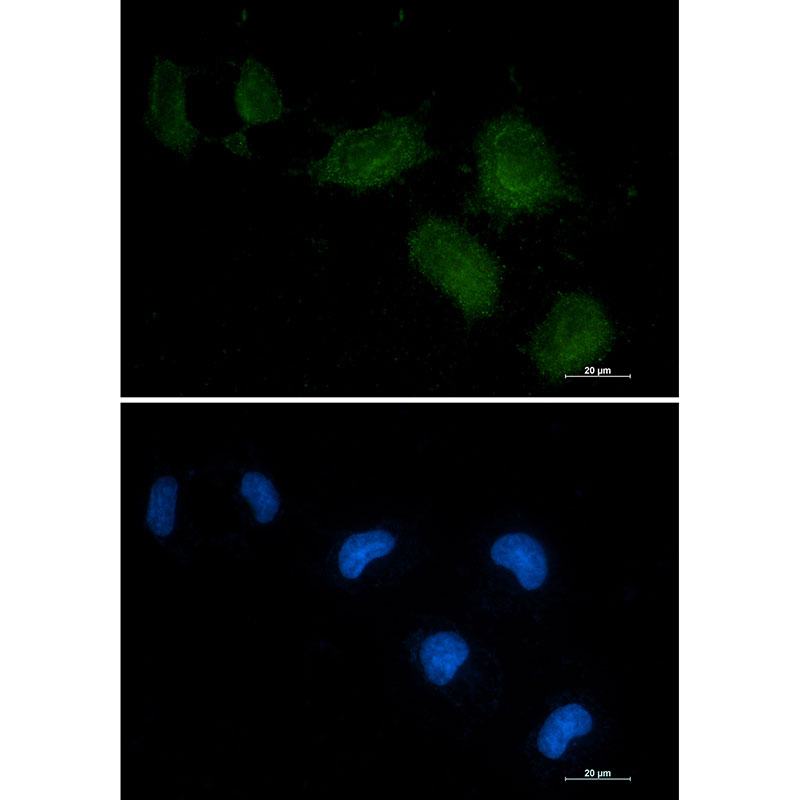 Immunocytochemistry analysis of Vitamin D Binding Protein (green) in HEPG2 using Vitamin D Binding Protein antibody,and DAPI(blue). |