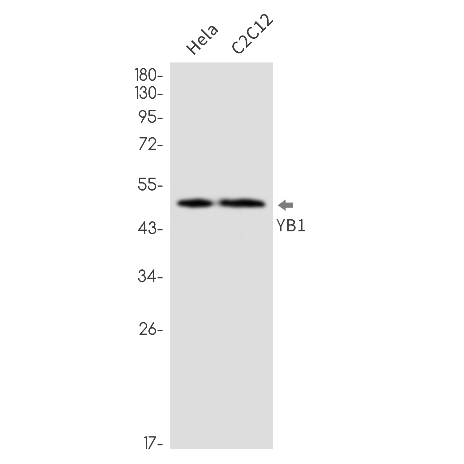 Western blot analysis of YB1 in Hela, C2C12 lysates using YB1 antibody. |