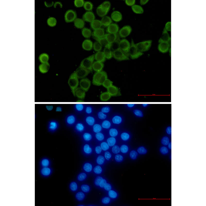 Immunocytochemistry analysis of YB1 (green) in hela using YB1 antibody,and DAPI(blue). |