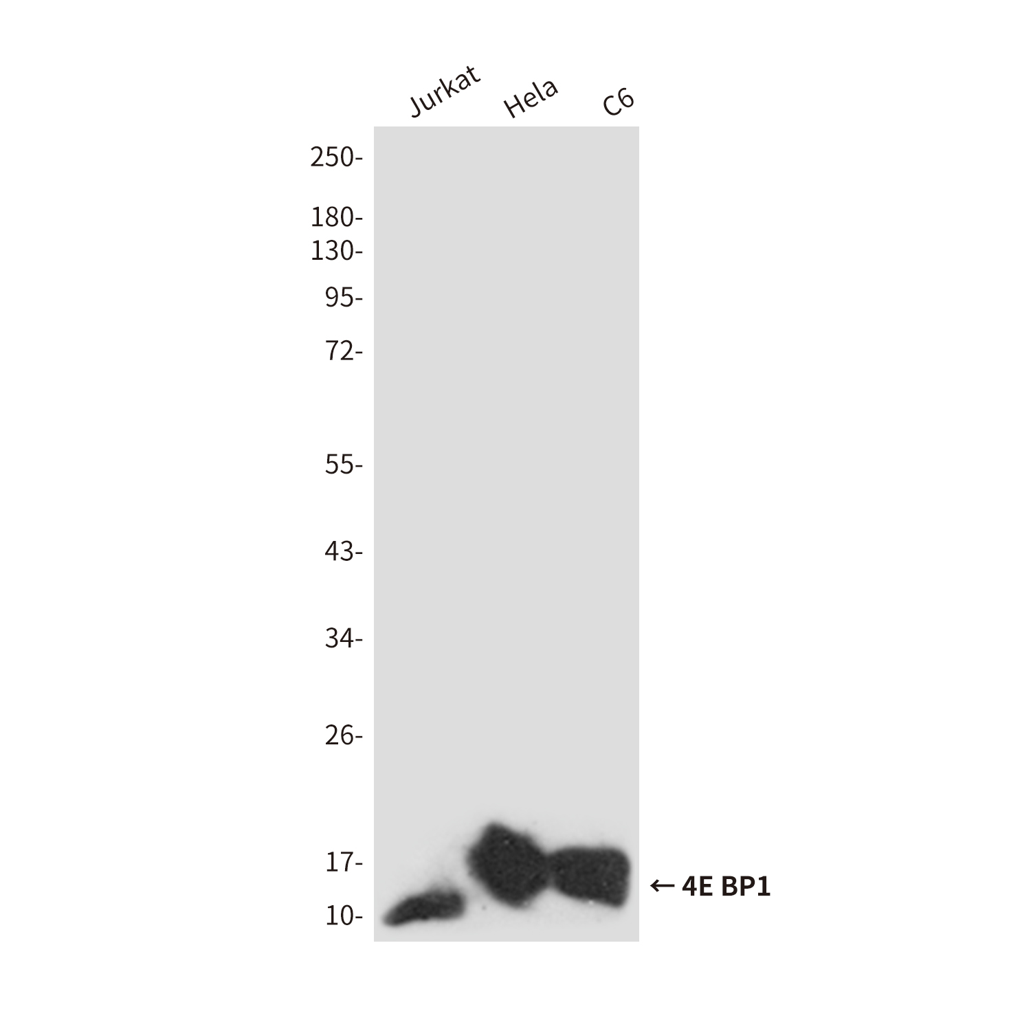 Western blot analysis of 4E BP1 in Jurkat, Hela and C6 lysates using 4EBP1 antibody. |