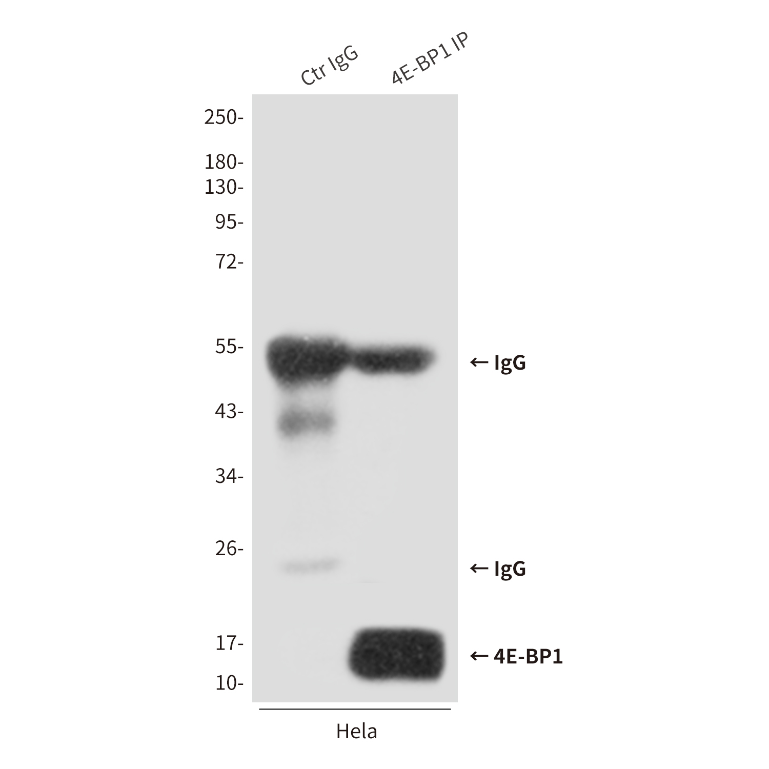 Immunoprecipitation analysis of 4E BP1 in Hela lysates using 4EBP1 antibody. |