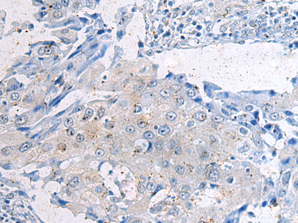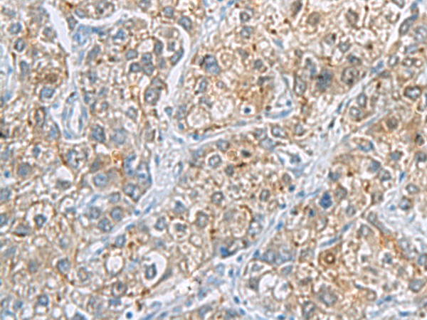 The image is immunohistochemistry of paraffin-embedded Human liver cancer tissue using P07062(ABCB5 Antibody) at dilution 1/70. (Original magnification: ×200) |