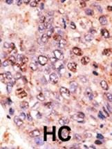 Formalin-fixed and paraffin-embedded human cancer tissue reacted with the primary antibody, which was peroxidase-conjugated to the secondary antibody, followed by DAB staining. This data demonstrates the use of this antibody for immunohistochemistry; clinical relevance has not been evaluated. BC = breast carcinoma; HC = hepatocarcinoma. |